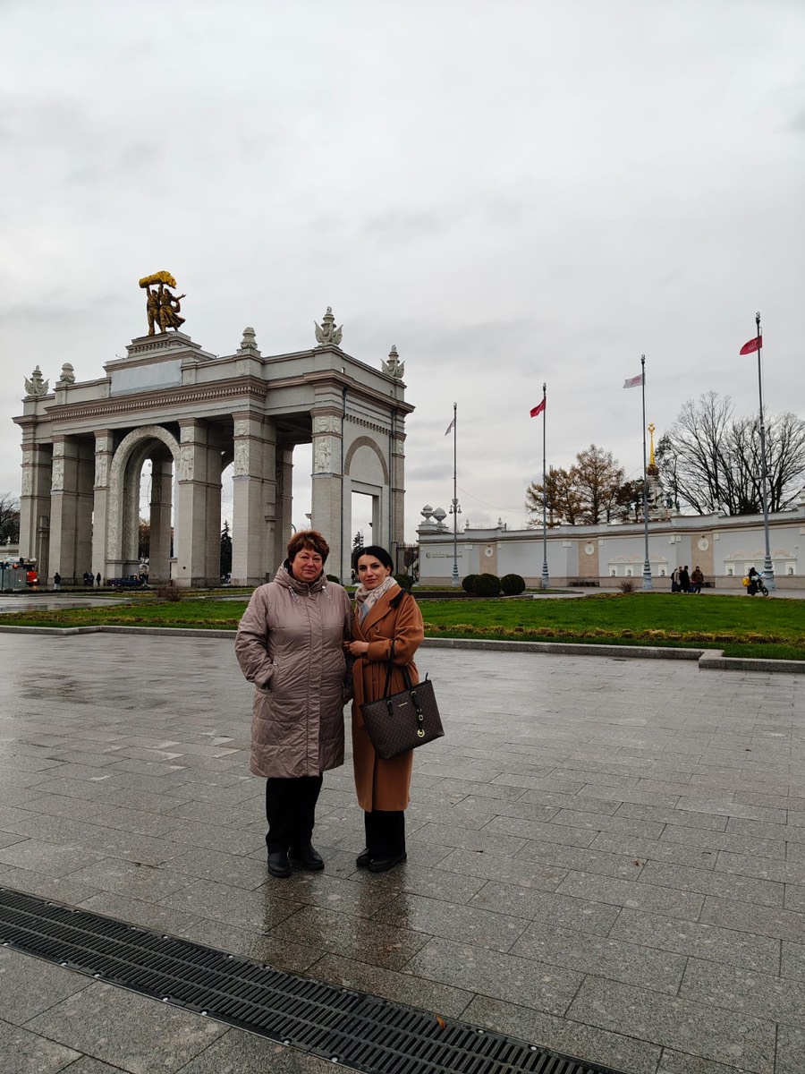 Мой путь учителя — это не только уроки за закрытой дверью класса. Это открытая история, запечатлённая в моментах искренней радости и больших побед. Вот строка наград в школьном актовом зале и цветы от детей, говорящие больше любых слов. Вот высокая трибуна, с которой делишься мыслями, и коллеги рядом, чья поддержка делает нас командой. А здесь я стою на фоне арки главного входа ВДНХ — такой же триумфальной, как и мир знаний, который мы открываем вместе с учениками.